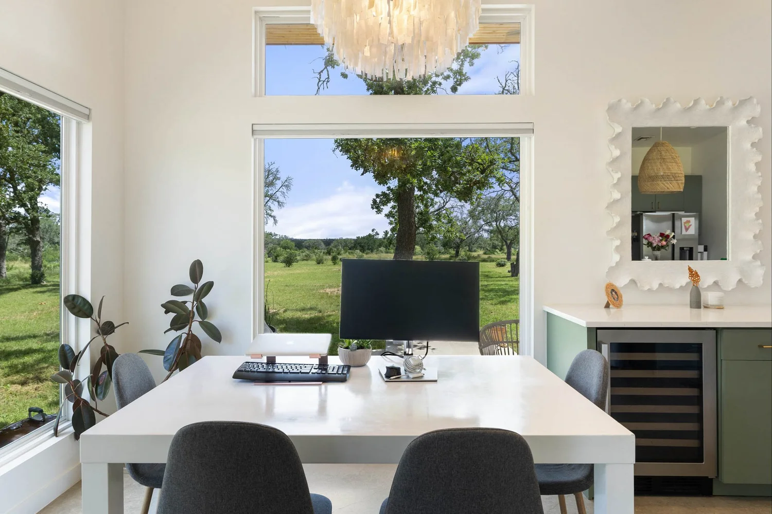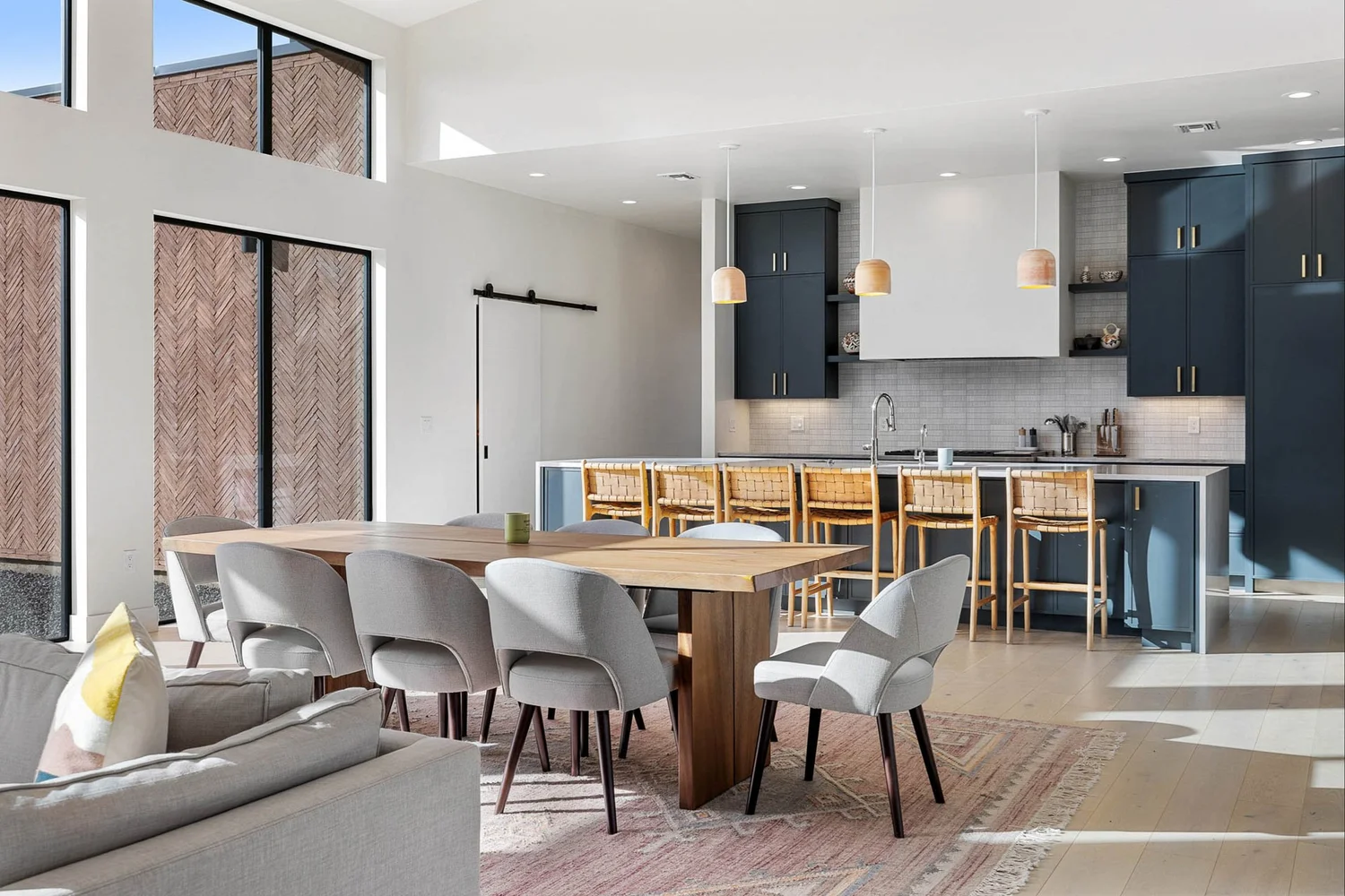 - Shiplap ceiling and large picture windows
