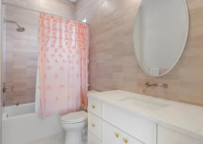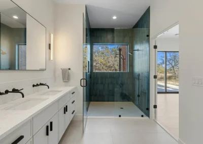 The residence offers dual primary suites for ultimate privacy and flexibility, along with a third guest suite and a fourth bedroom ideal for an executive office, studio, or playroom. The Owner’s Retreat is a serene sanctuary, highlighted by a private veranda, custom walk-in closet with direct laundry room access and stunning spa-inspired bath featuring a volcanic limestone soaking tub and glass-enclosed wet area.