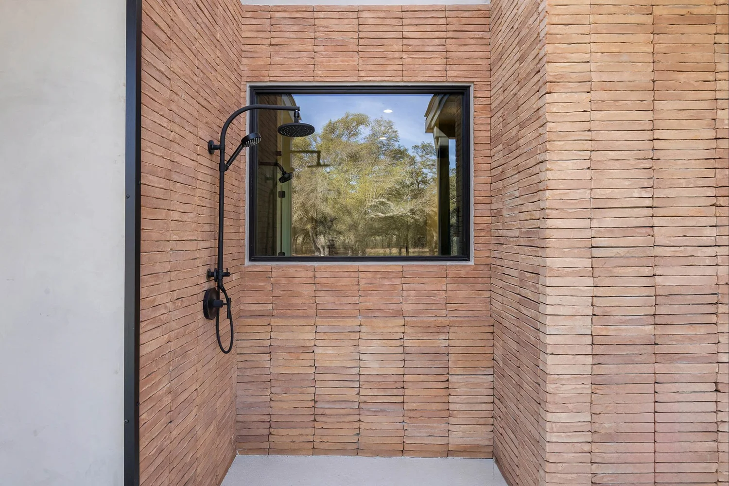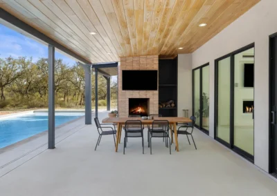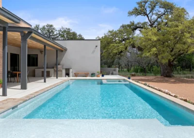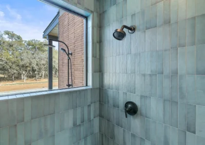 Outdoors, the estate unfolds like a private resort. An oversized lounge pool, jetted spa, and outdoor shower invite relaxation beneath wide Texas skies, while the D’Hanis brick fireplace and outdoor television create an unforgettable setting for al fresco dining and evening gatherings.