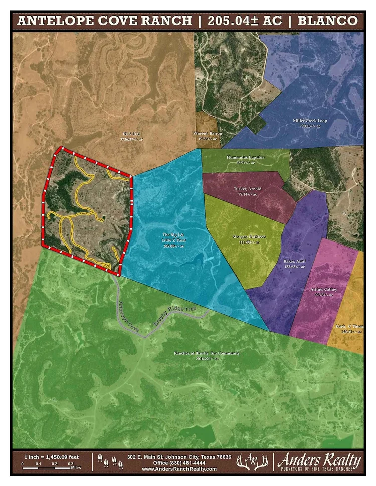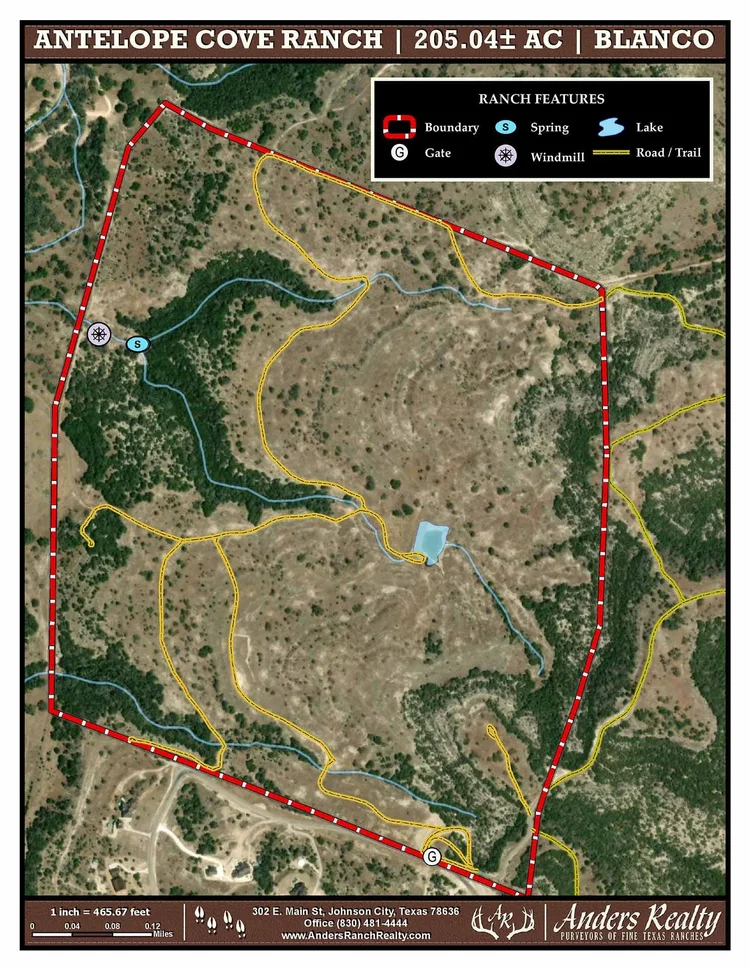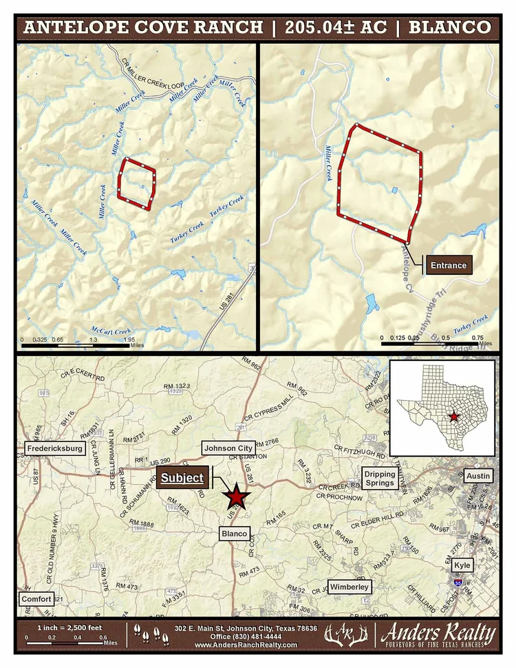 A gorgeous 205+ acre legacy ranch located in Central Blanco County between Johnson City and Blanco (great restaurants, music venues, shopping). This ranch is within the magic hour drive from both Austin and San Antonio. This stunning property carries a Conservation Easement preserving its scale and beauty for generations. Access to the ranch is through the Ranches at Brushy Top which is blacktop all the way to the subject property entrance. Directions: From Austin US 290 through Dripping Springs to left on US 281 to right at Ranches of Brushy Top North Entrance. Straight in all the way up the hill. Right at stop sign to left on Antelope Cove. Subject gate on right.
