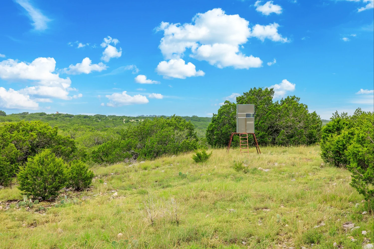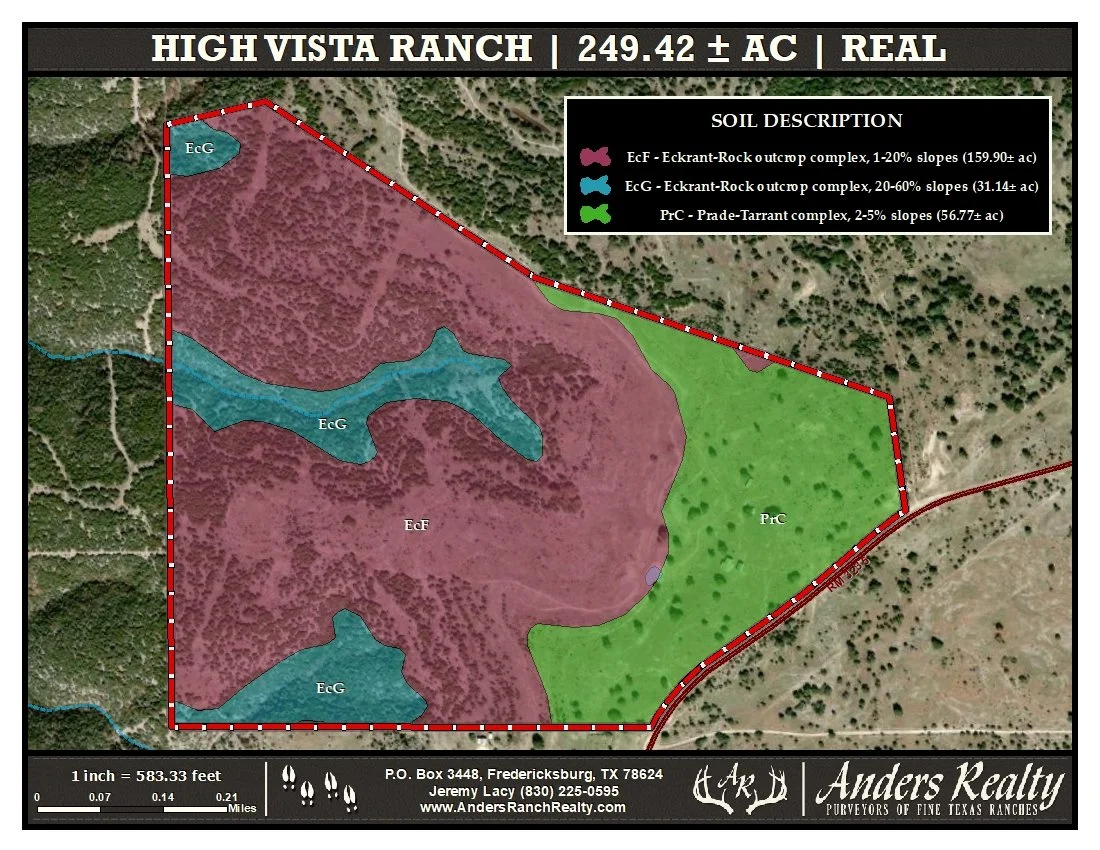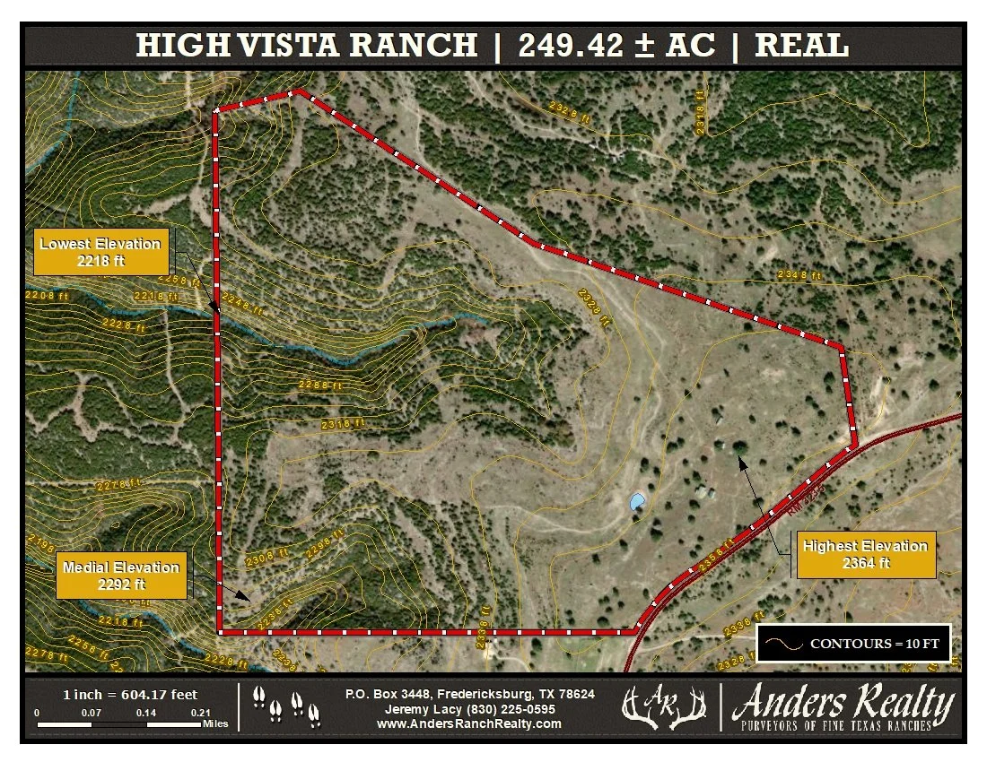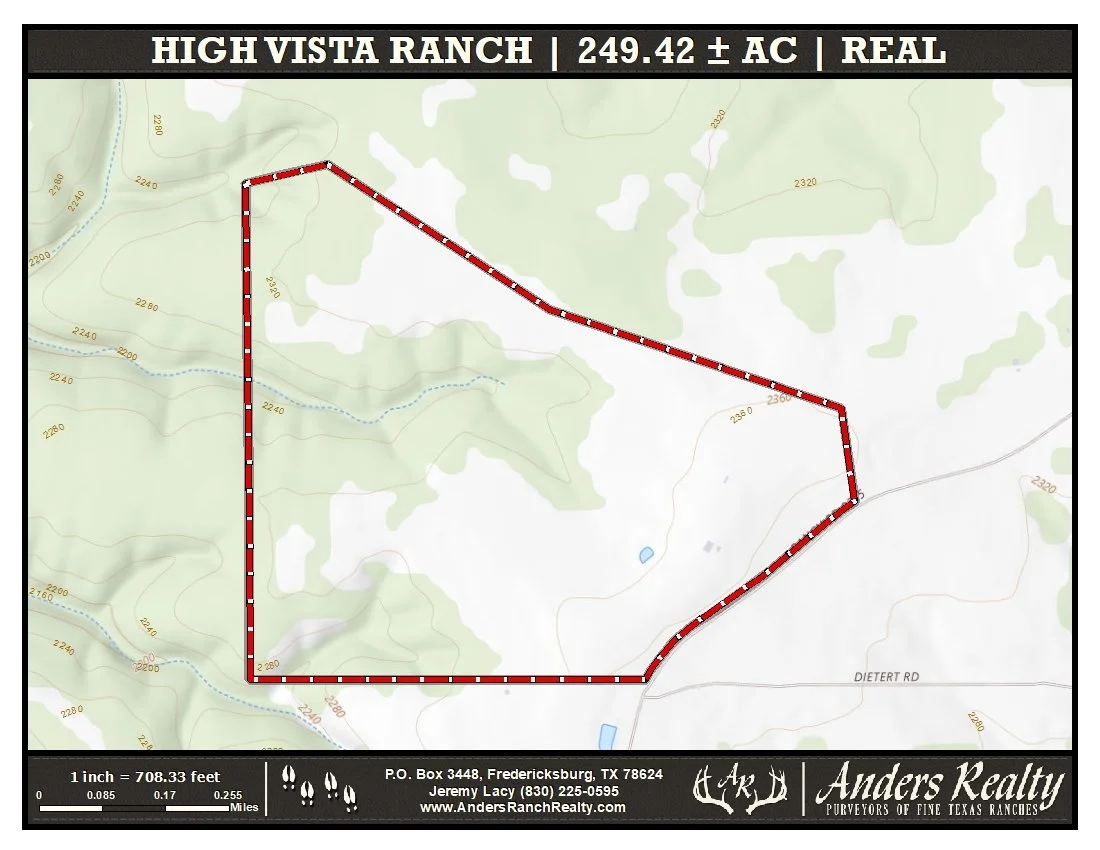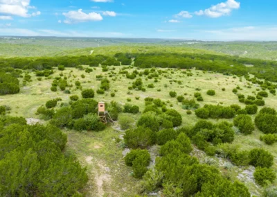 High Vista Ranch (249.42 ac) is an unrestricted, turn-key hunting property with excellent improvements in north-central Real County. The ranch features a comfortable 4-bedroom, 2.5-bath manufactured home with outstanding views, a 1,250 SF metal barn, and abundant native and exotic wildlife. The property is high-fenced along the north, west, and south boundaries, and has 1,980’ of frontage along the north line of Ranch Road 3235.