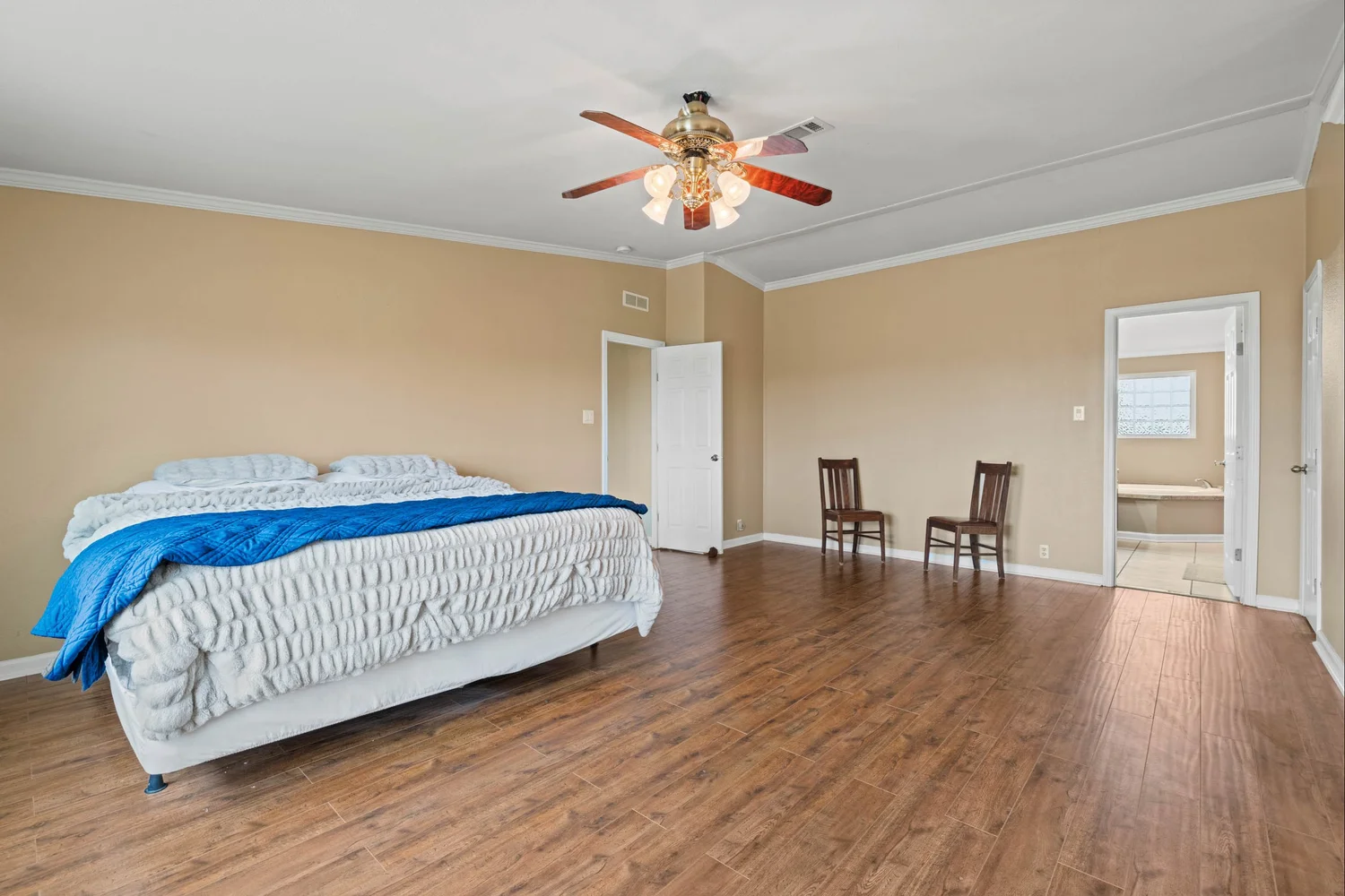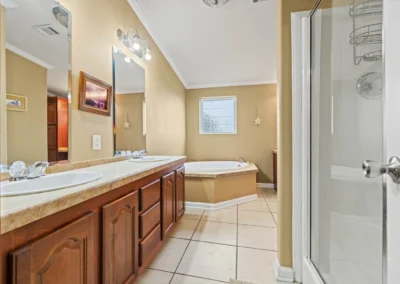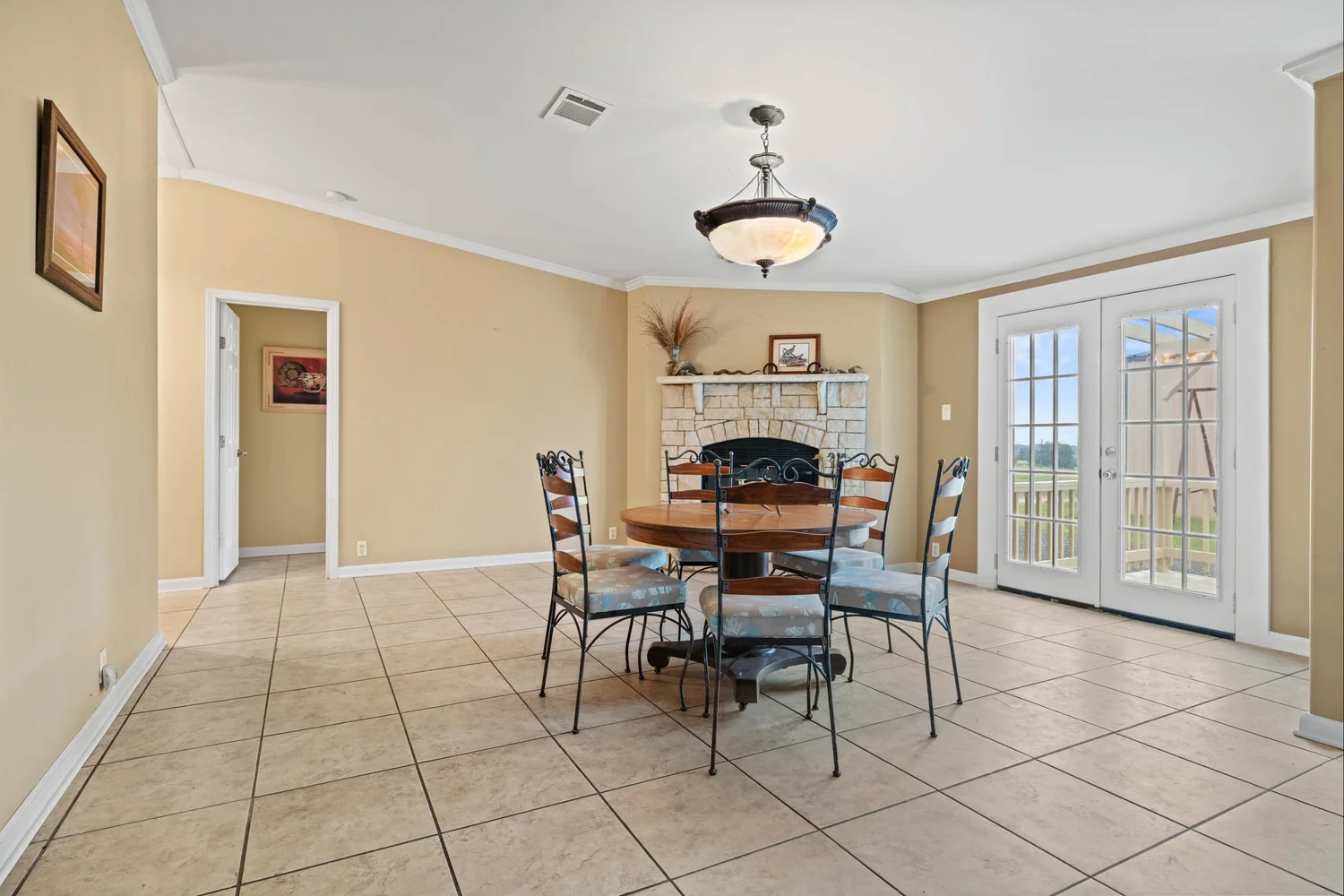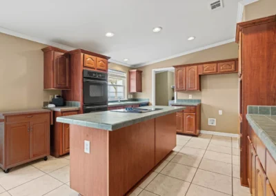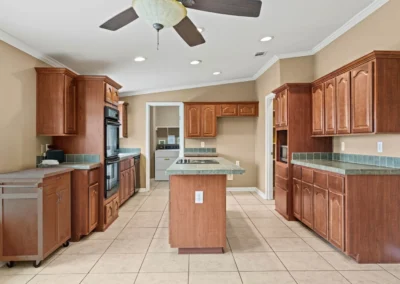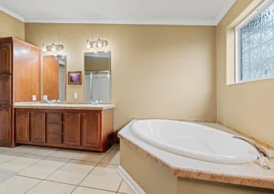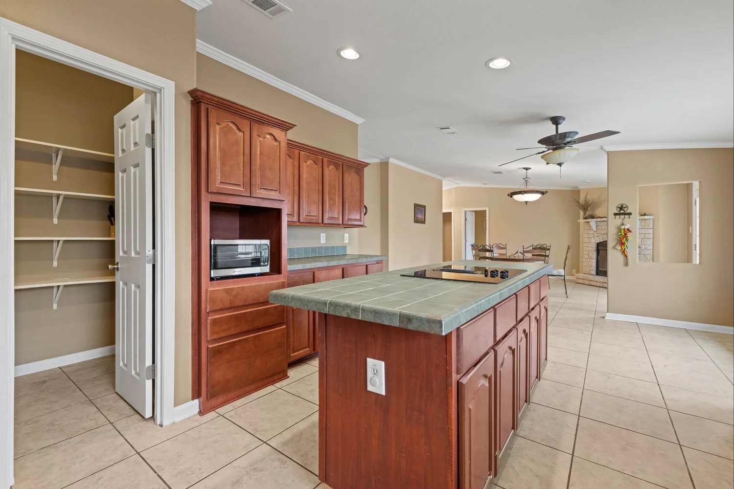 The master suite features a spacious bedroom, a sitting area, a walk-in closet, a linen closet, double vanity, large garden tub, shower, and a toilet room. The kitchen has generous storage and cabinetry, a double stainless sink, a dishwasher, walk-in pantry, double oven, and an island with an electric stovetop. The open floor plan connects the kitchen, spacious family room, and dining area, which is accented with a gas burning fireplace.