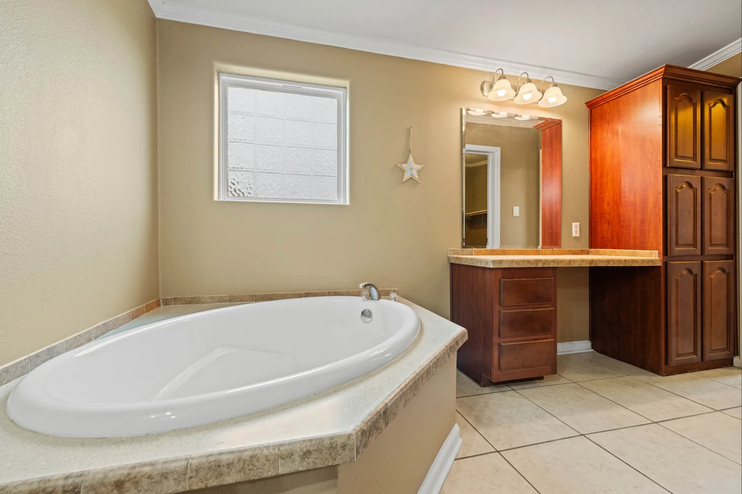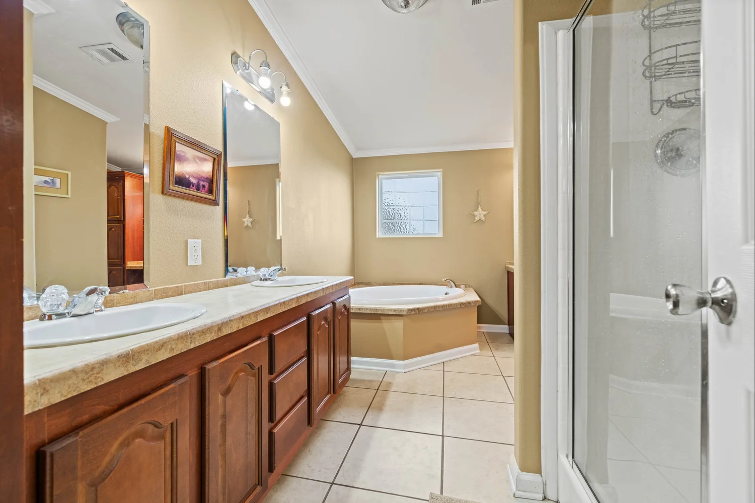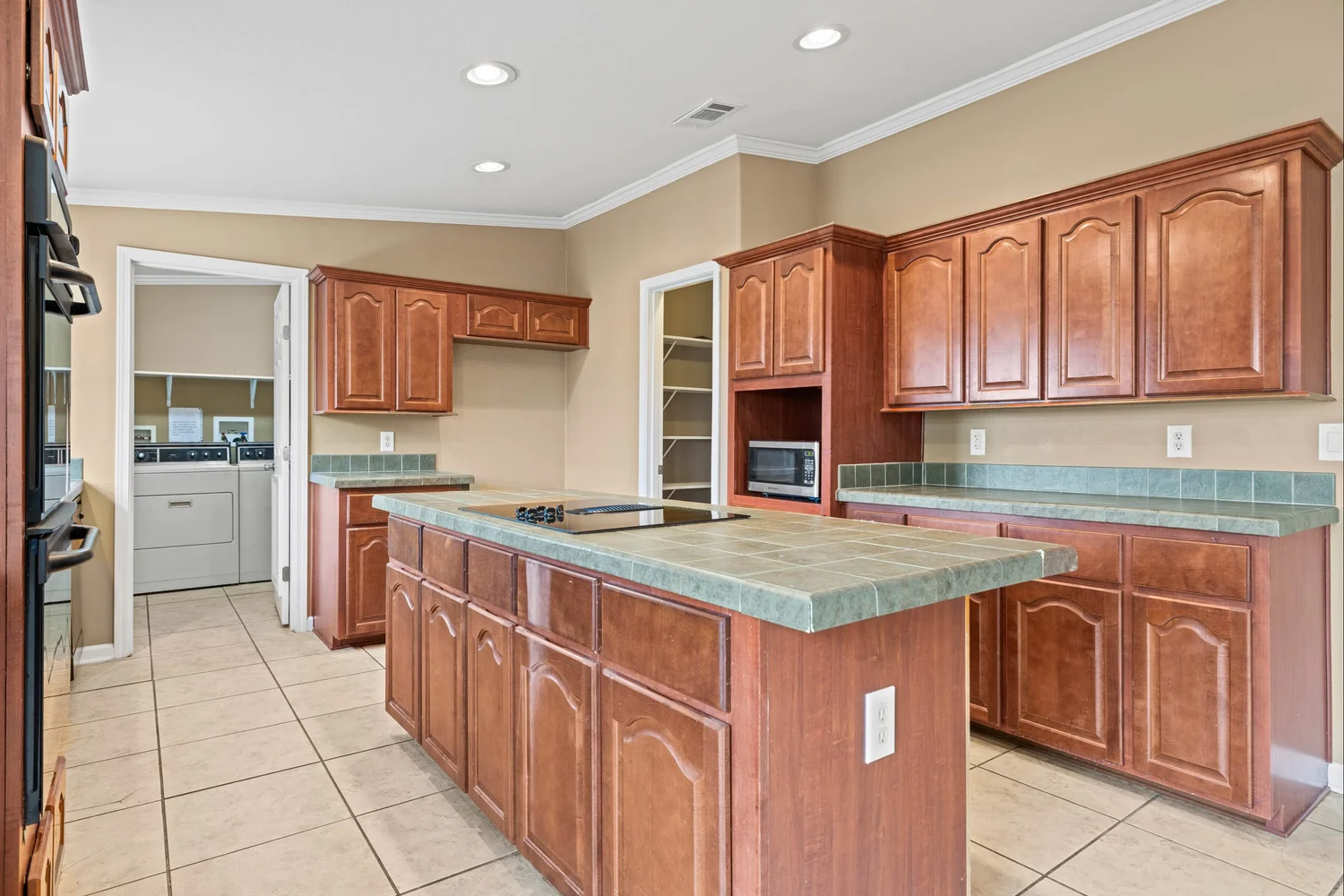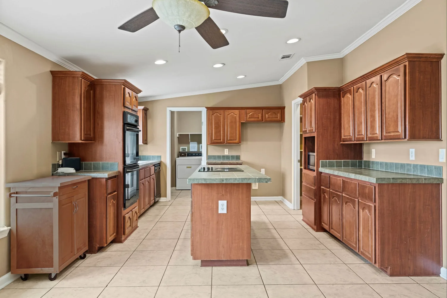 The master suite features a spacious bedroom, a sitting area, a walk-in closet, a linen closet, double vanity, large garden tub, shower, and a toilet room. The kitchen has generous storage and cabinetry, a double stainless sink, a dishwasher, walk-in pantry, double oven, and an island with an electric stovetop. The open floor plan connects the kitchen, spacious family room, and dining area, which is accented with a gas burning fireplace.