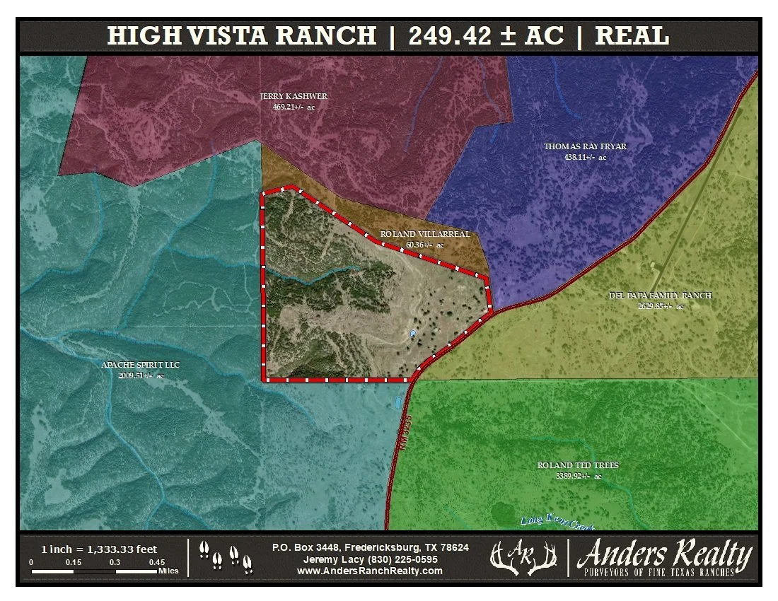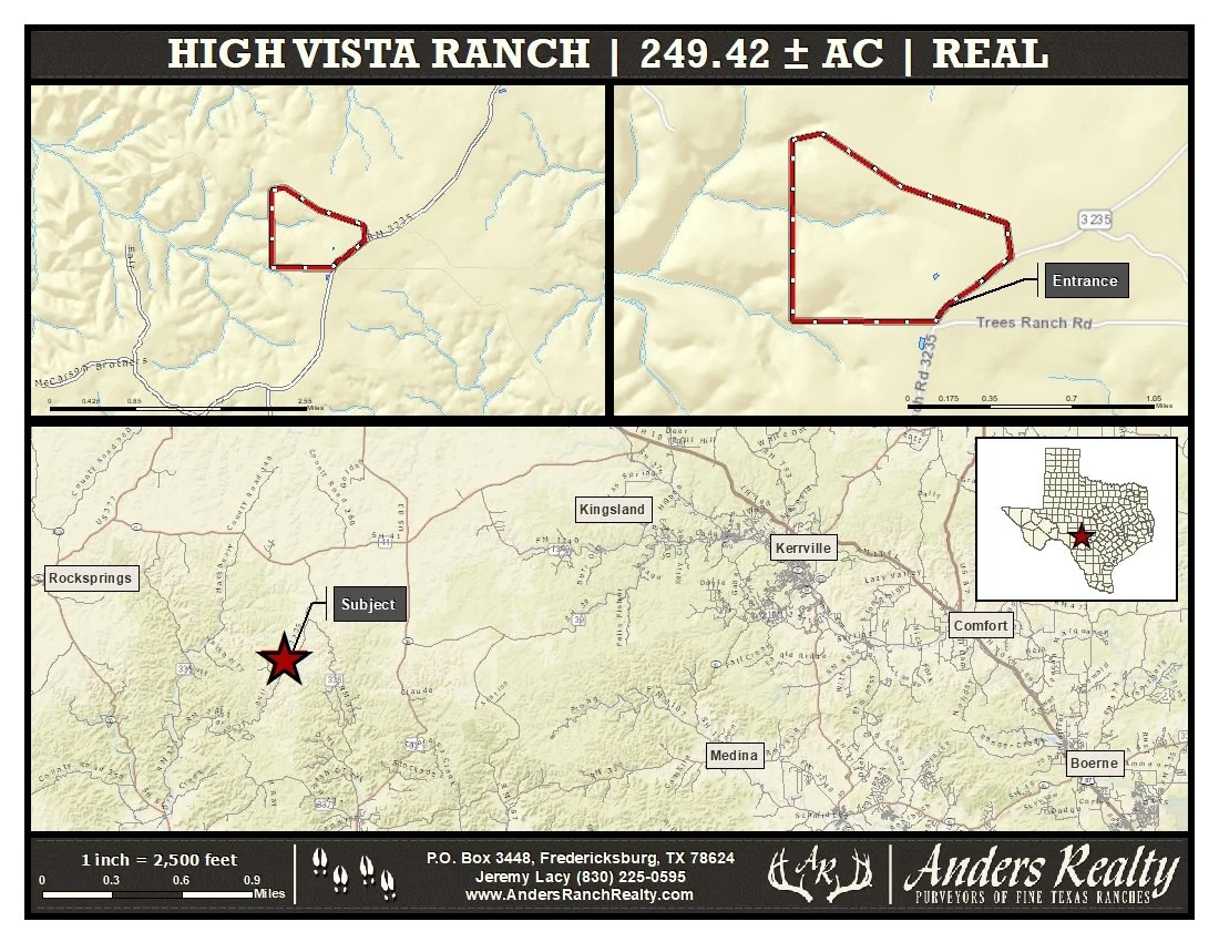 High Vista Ranch sits in north-central Real County, with easy access to Interstate 10, Leakey, Rocksprings, and Kerrville. The ranch is 19-miles from Garven Store, 22-miles NNW of Leakey, 36-miles SE of Rocksprings, and 58-miles west of Kerrville. The property has 1,980 feet of frontage along the north line of RR 3235, which is a lightly travelled asphalt road in excellent condition.