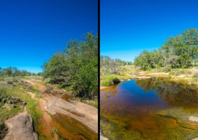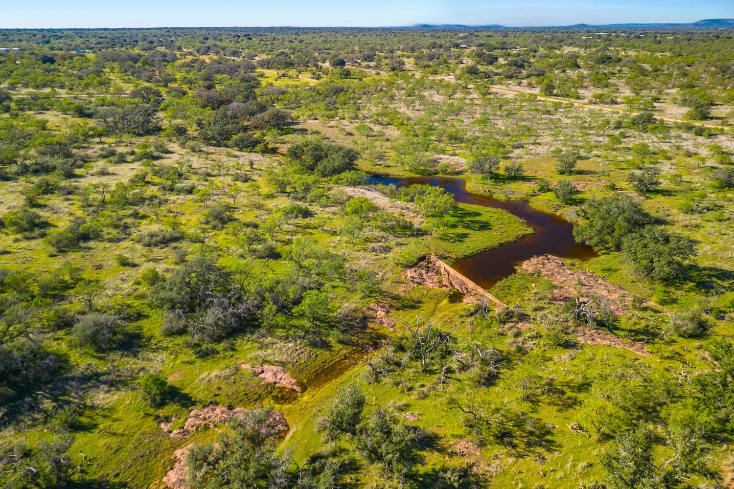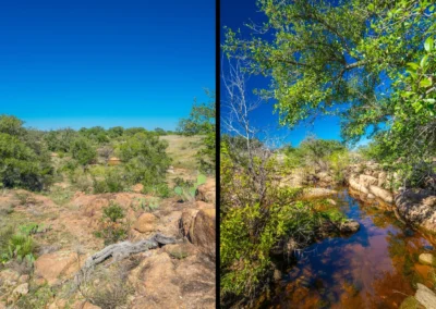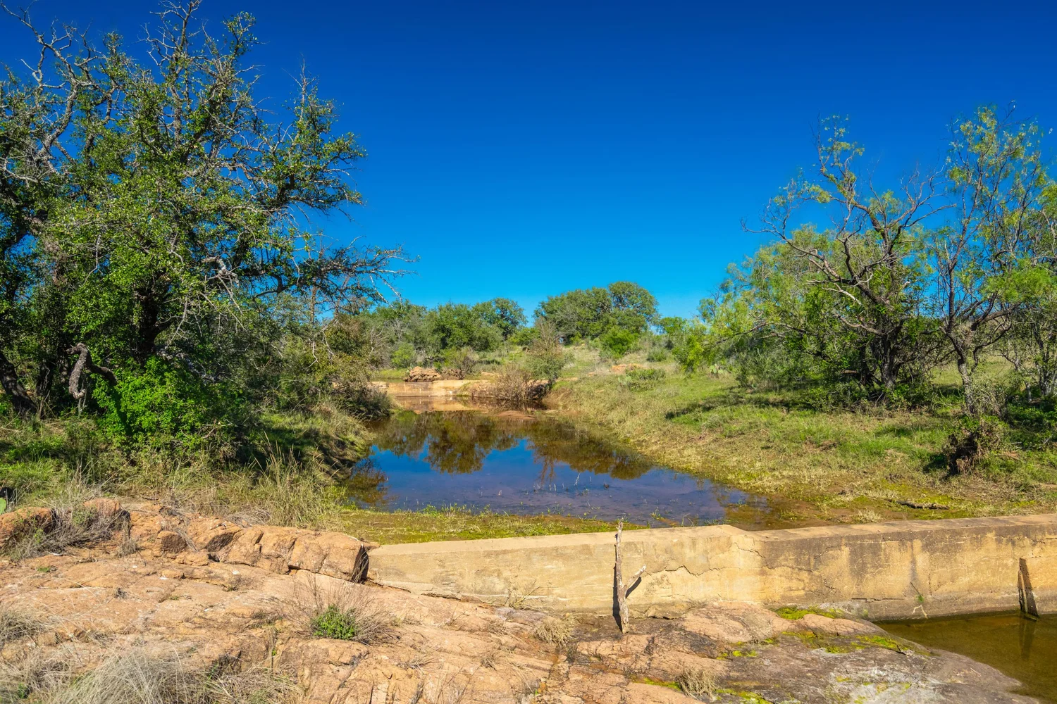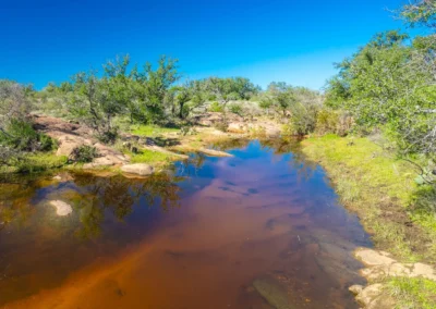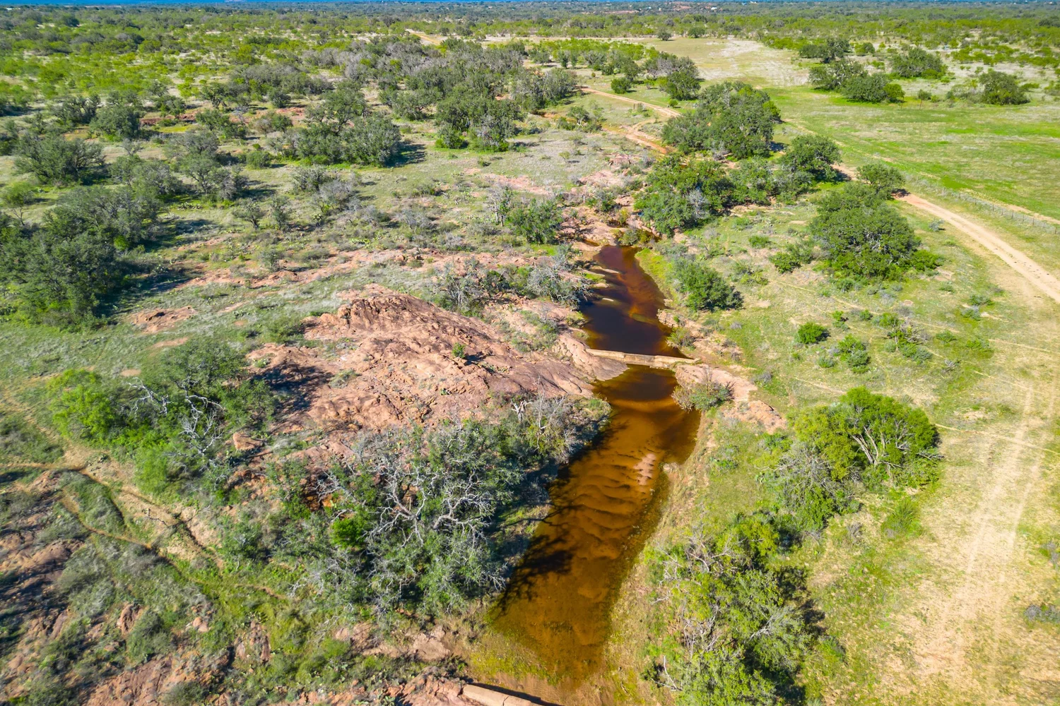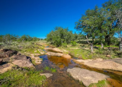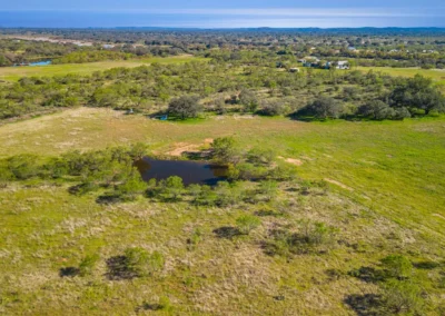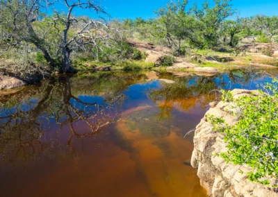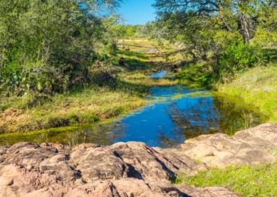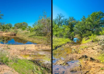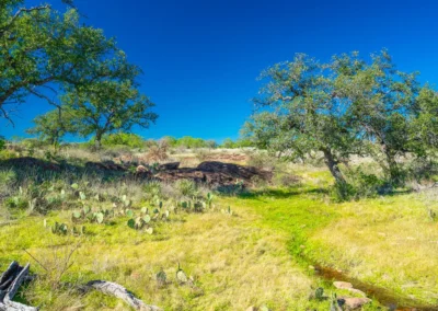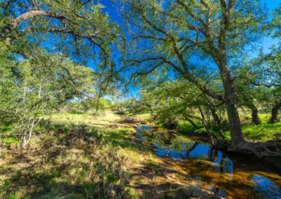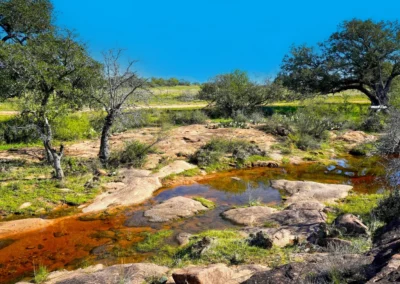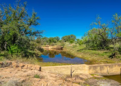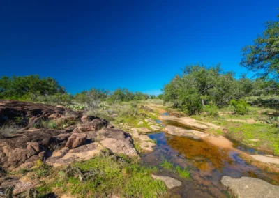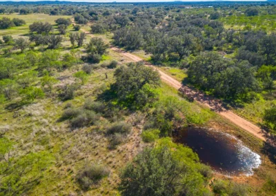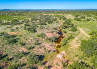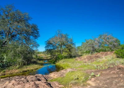 There is a secondary creek, lined with intricate granite outcroppings, that enters this portion of the property along the west boundary, then turns south and eventually flows into the Llano River. Along this 4,420’ creek, there are three (3) concrete “spreader” dams that back up water seasonally. The largest is a 0.30 pond on the upper end of the drainage. There is also a 0.25 ac pond with an earthen dam near the west fence line. There are no water wells on this tract.
