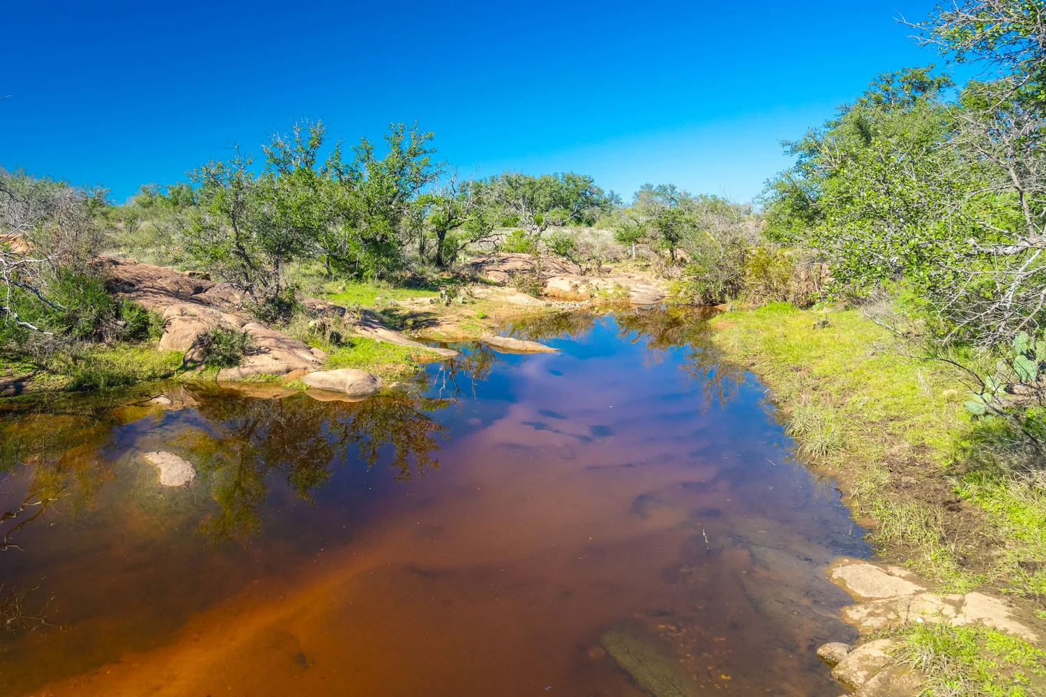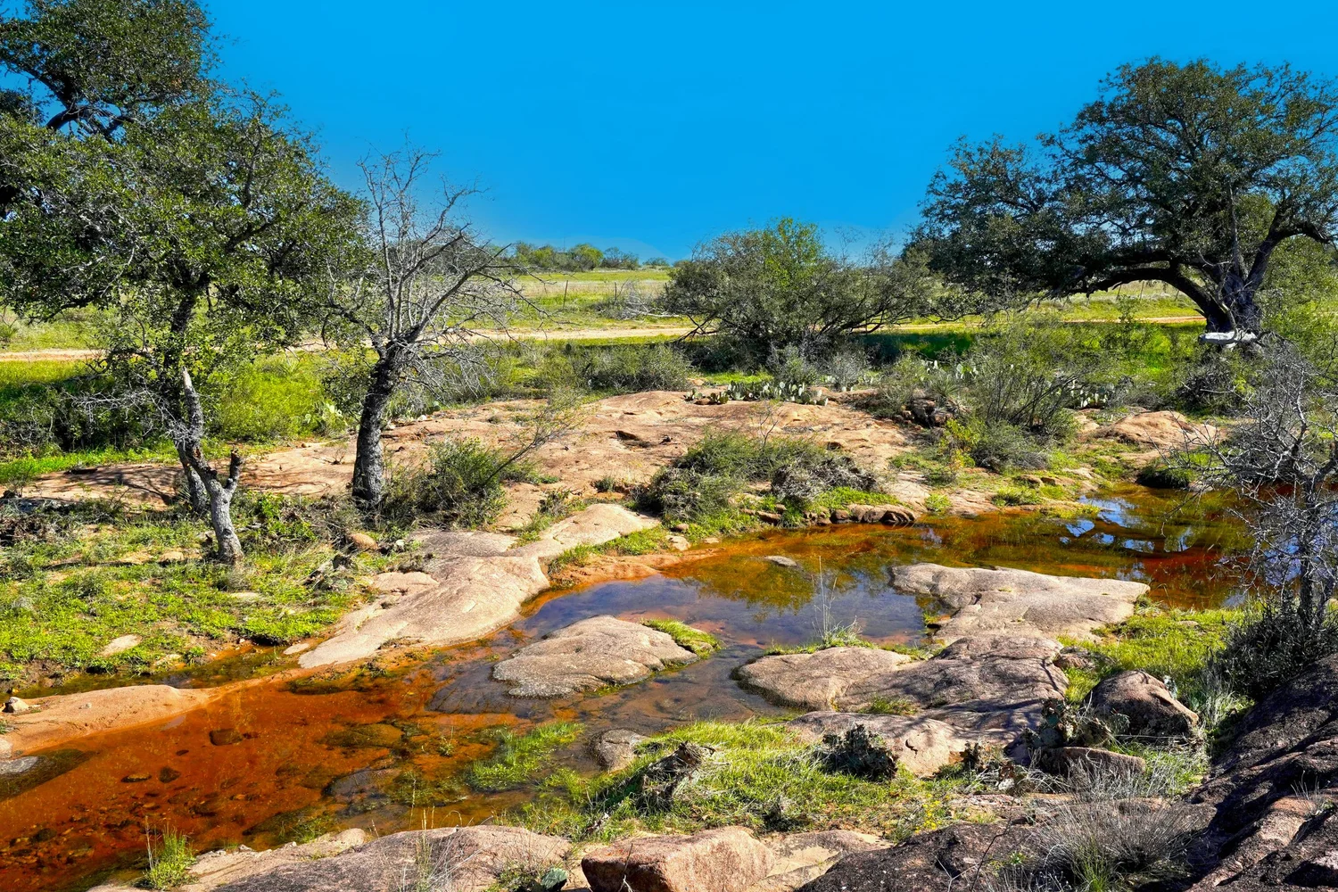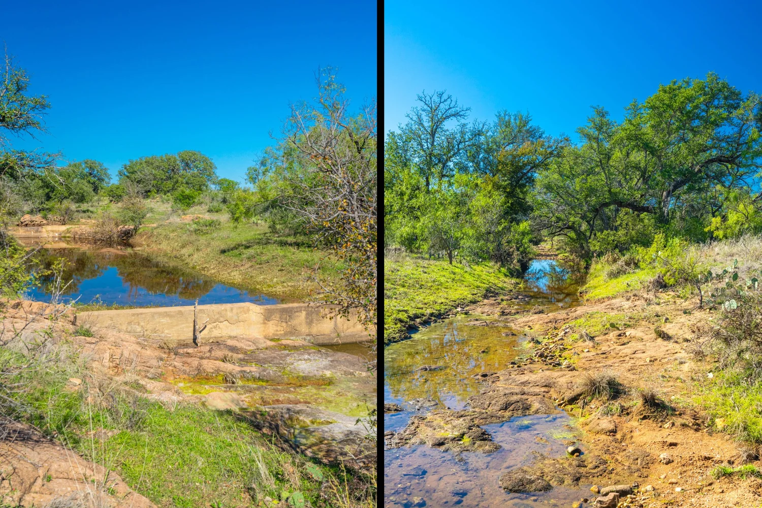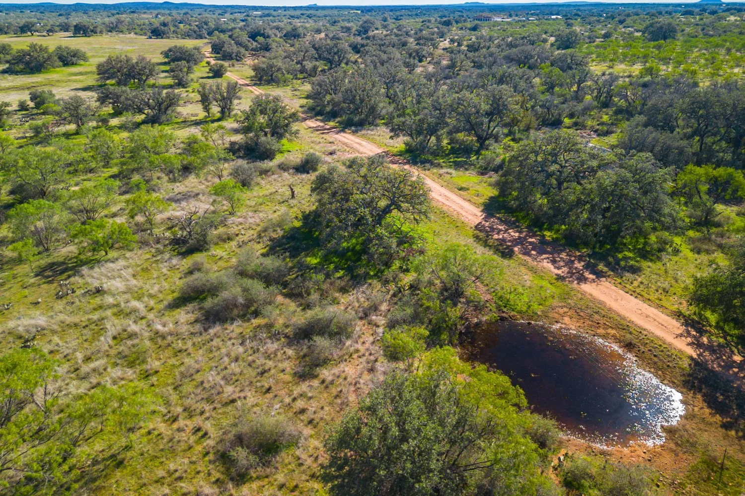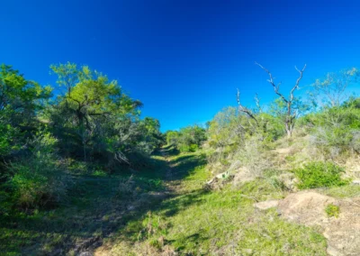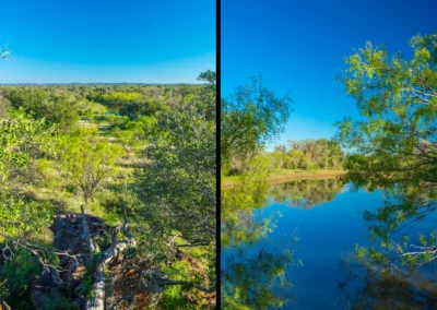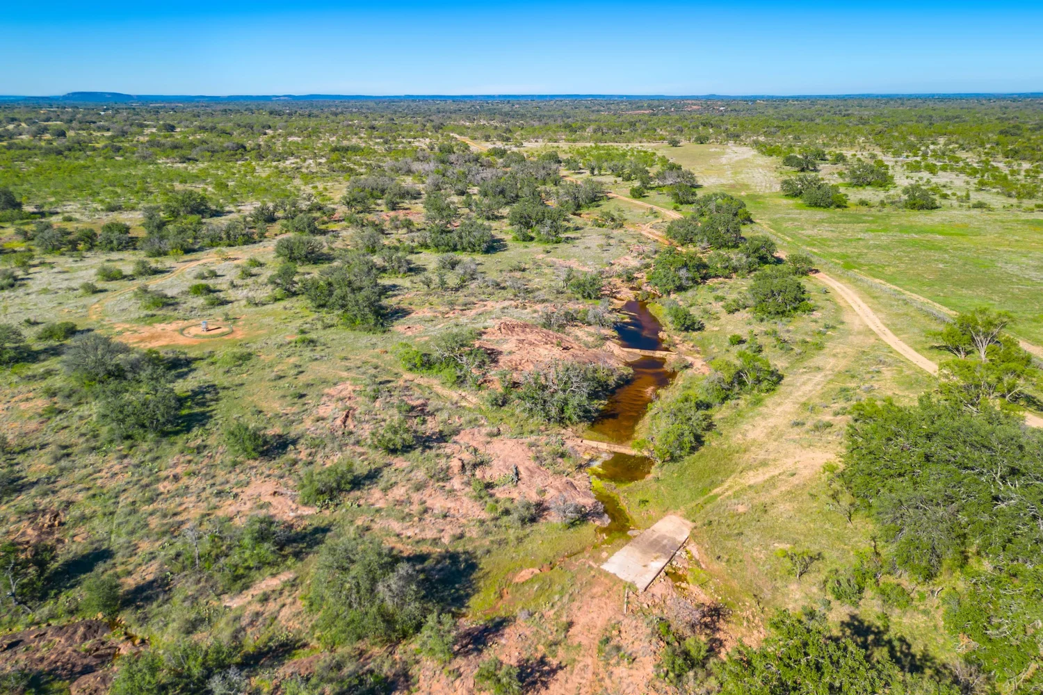 There is a secondary creek, lined with intricate granite outcroppings, that enters this portion of the property along the west boundary, then turns south and eventually flows into the Llano River. Along this 4,420’ creek, there are three (3) concrete “spreader” dams that back up water seasonally. The largest is a 0.30 pond on the upper end of the drainage. There is also a 0.25 ac pond with an earthen dam near the west fence line. There are no water wells on this tract.