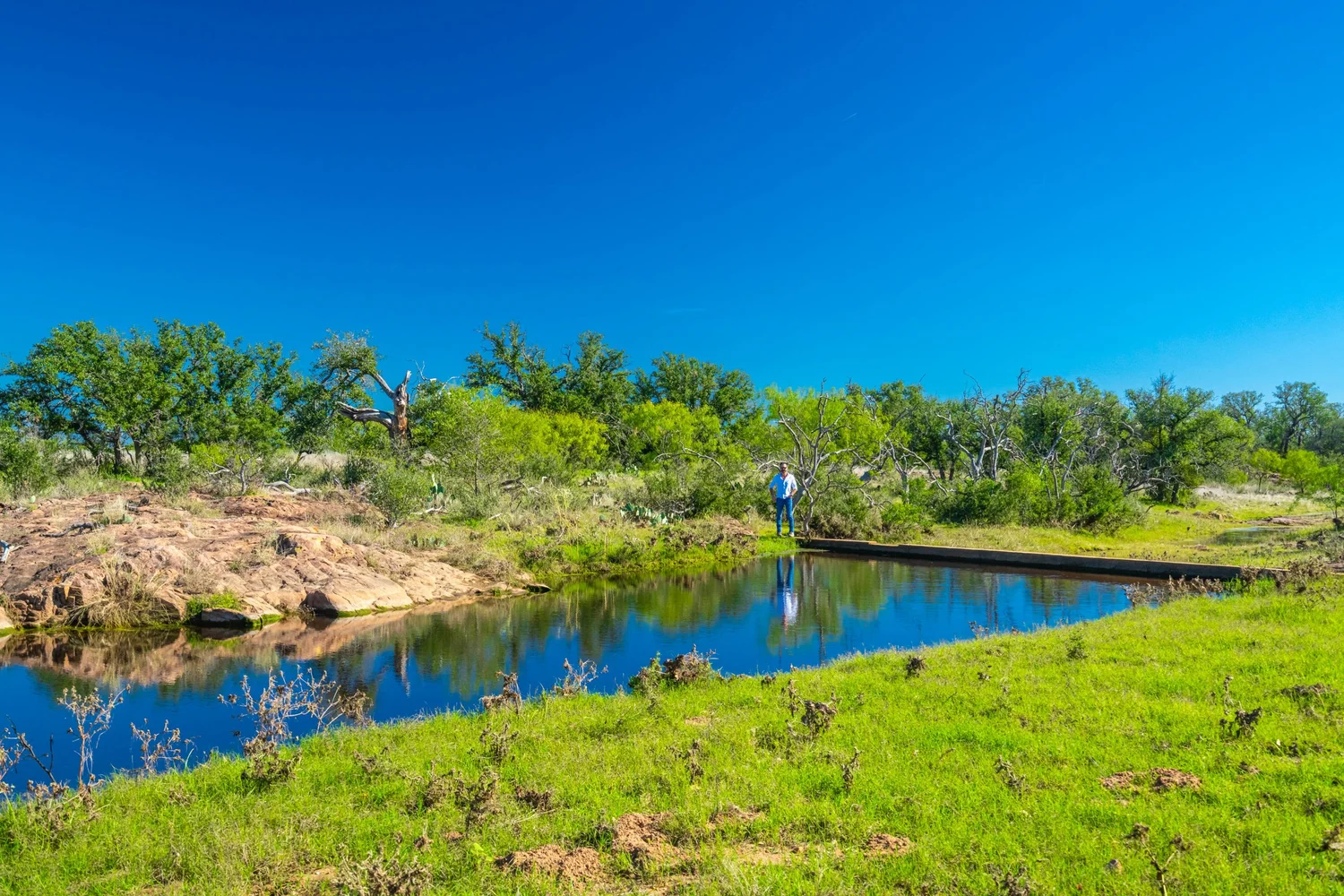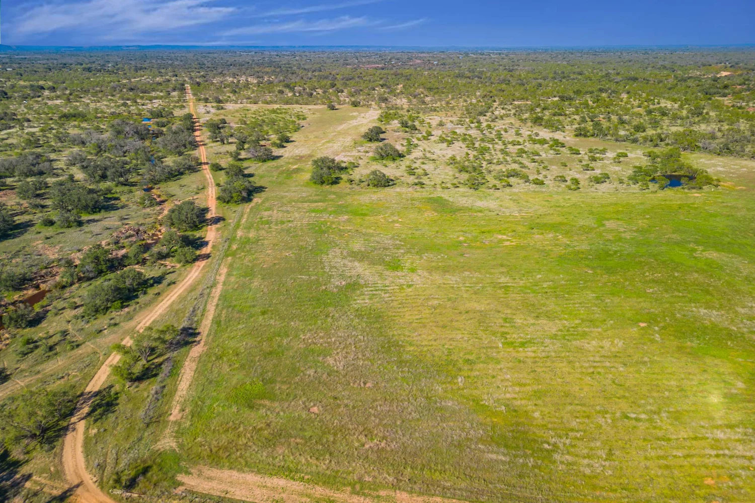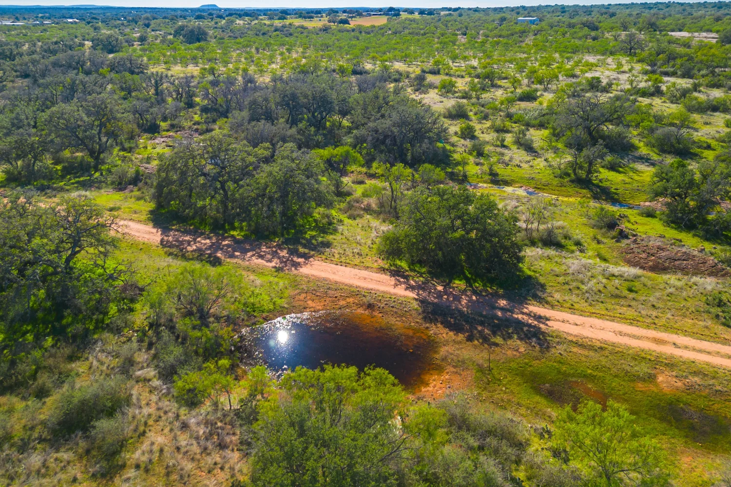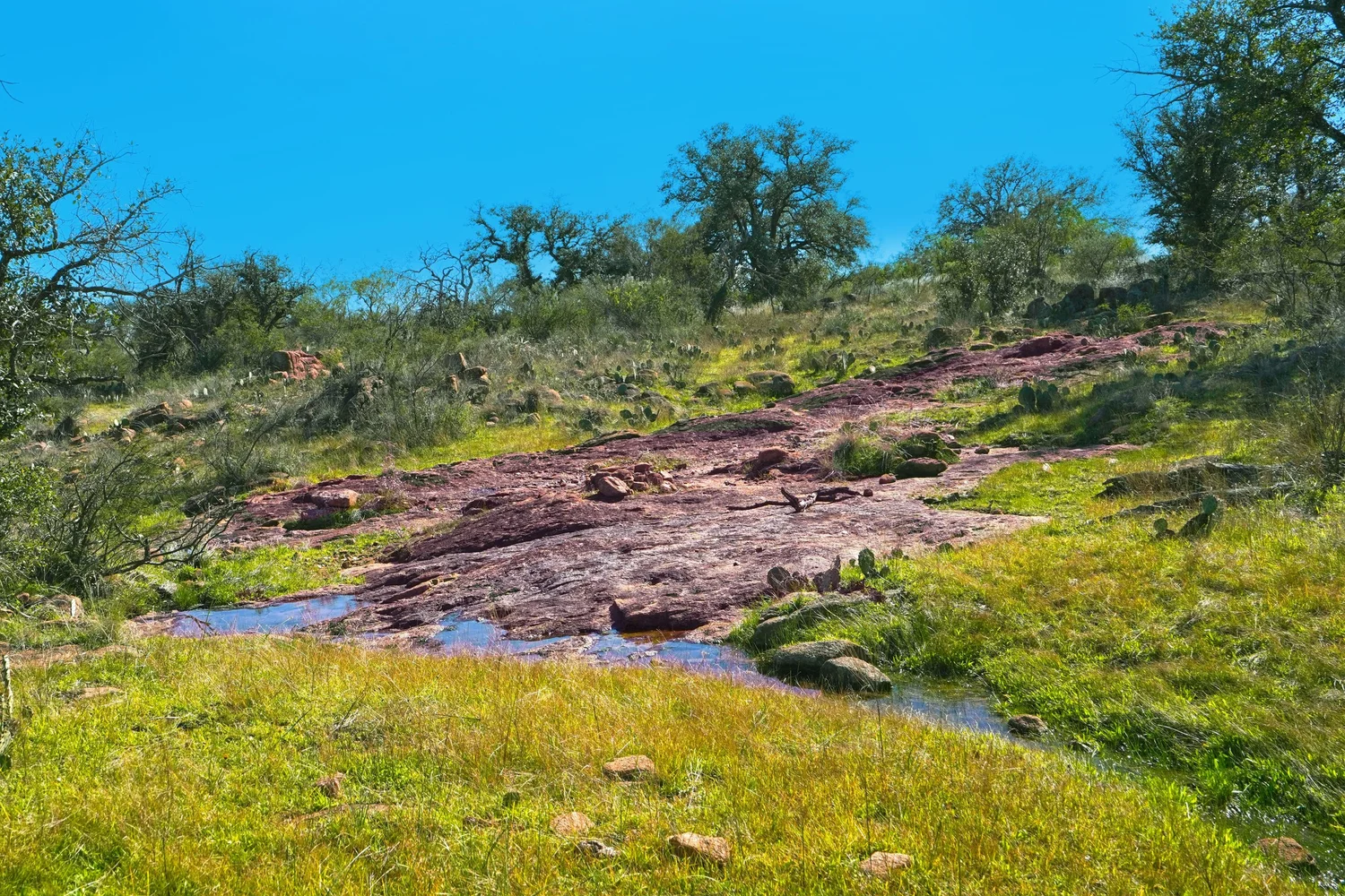 There is a secondary creek, lined with intricate granite outcroppings, that enters this portion of the property along the west boundary, then turns south and eventually flows into the Llano River. Along this 4,420’ creek, there are three (3) concrete “spreader” dams that back up water seasonally. The largest is a 0.30 pond on the upper end of the drainage. There is also a 0.25 ac pond with an earthen dam near the west fence line. There are no water wells on this tract.