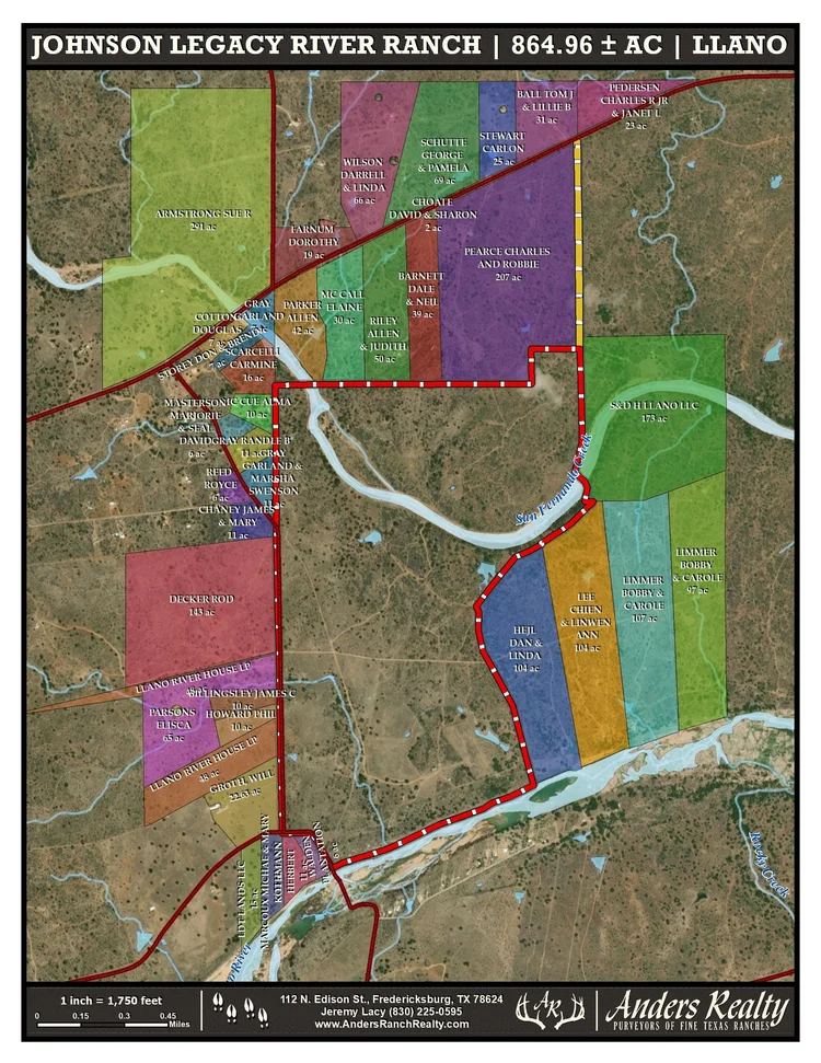 d. $53.82 for Rancho El Águila (62.54± ac) The Johnson Family River Ranch is a premier live water river ranch along the north bank of the Llano River that has been in the same family for over 100 years. This gorgeous, diverse Texas Hill Country property is ideally located 50 minutes from historic Fredericksburg, 40 minutes from Horseshoe Bay, 1.5 hours from Austin, and 12 minutes from Llano. With 3,940’ or 0.75 miles of uninterrupted Llano River frontage, a diverse mixture of mature oak and Pecan tree cover, scattered tillable pastures, stunning granite rock formations, deep loamy soils, distant panoramic views, and fantastic hunting, this exceptional legacy river property is perfect for a family recreational ranch or full-time residence.