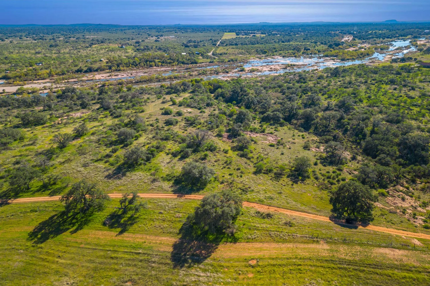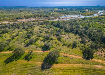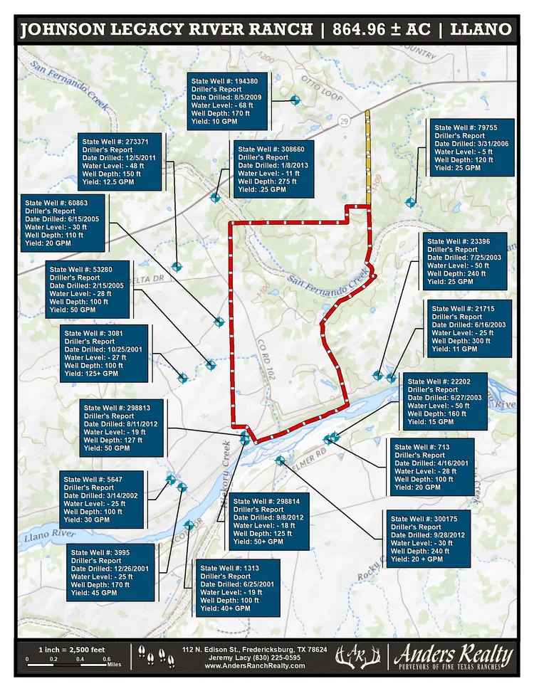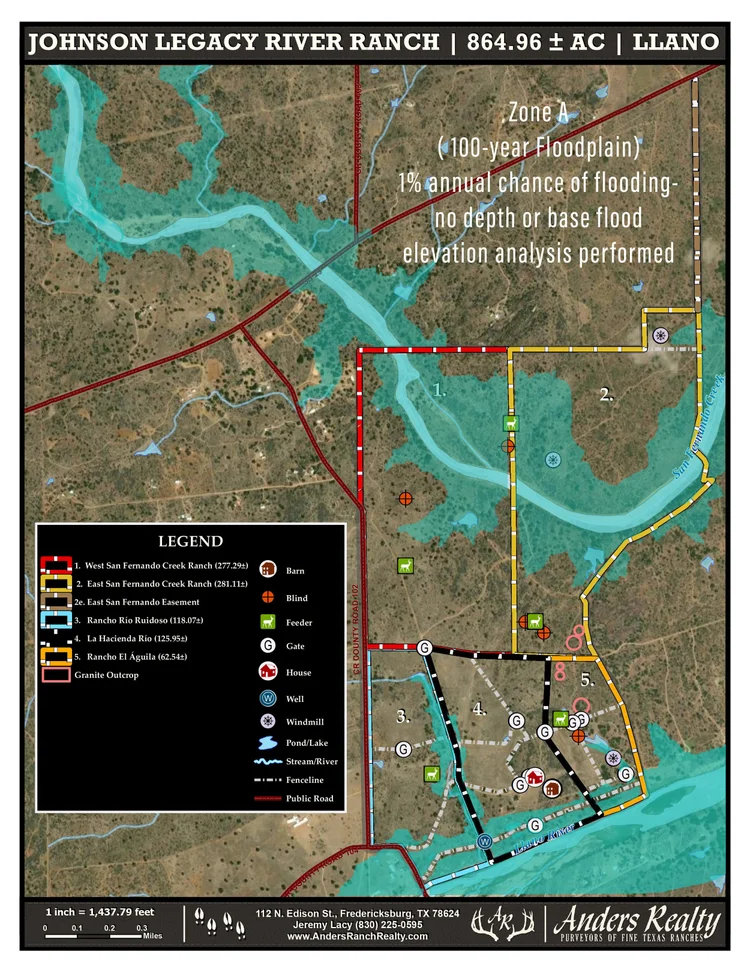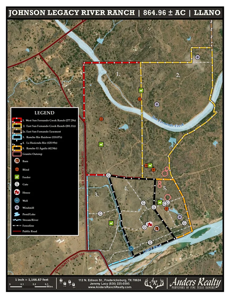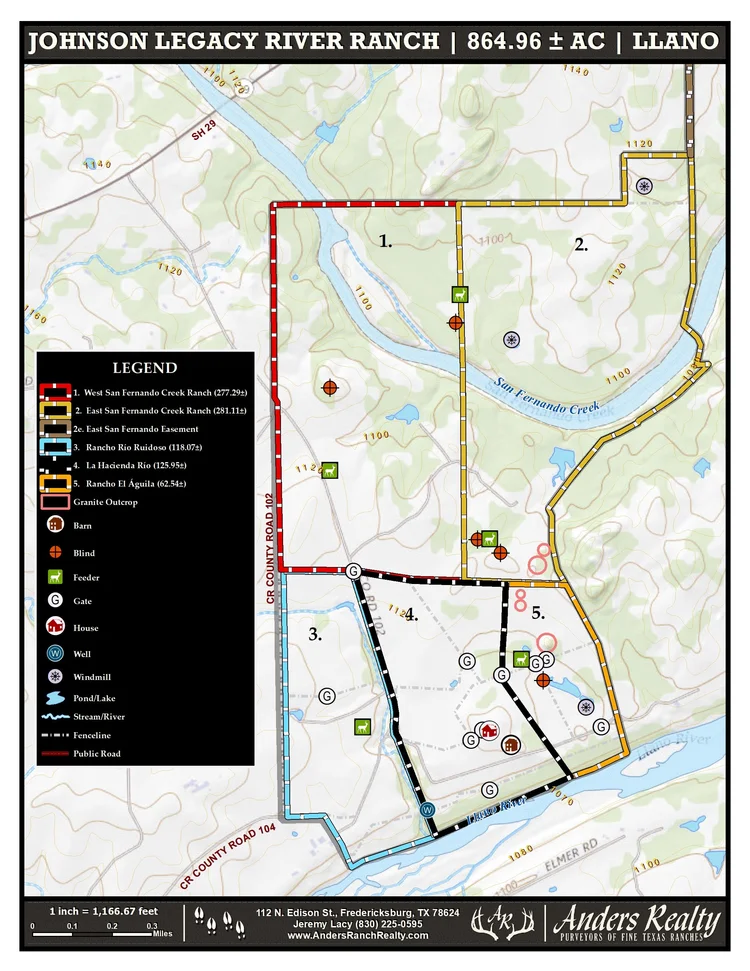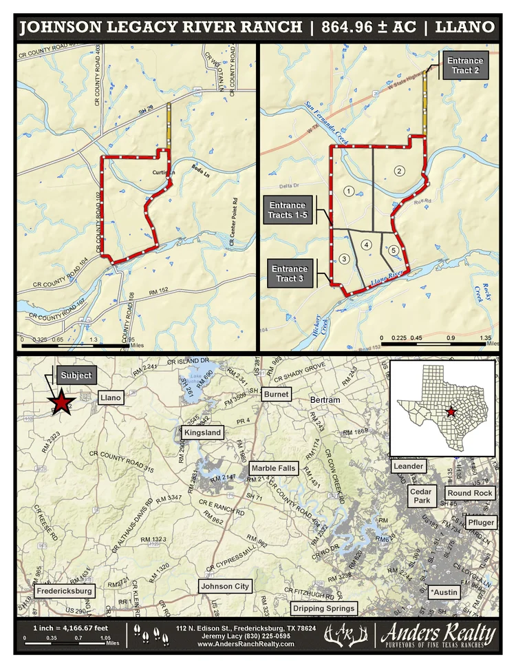 The ranch sits in the heart of the Texas Hill Country and is located 50 minutes from historic Fredericksburg, 40 minutes from Horseshoe Bay, 1.5 hours from Austin, and 12 minutes from Llano. The property sits just south of TX-29 along the east line of CR 102 with 4,565’ of paved county road frontage. Rue Rd., a gated, recorded and well-maintained easement road, runs along the north boundary of the property. Rue Rd. will be the primary point of access for the 125.05 ac (La Hacienda Rio) and 62.54 ac (Rancho El Aguila) tracts, if the property is sold in divided parcels.
